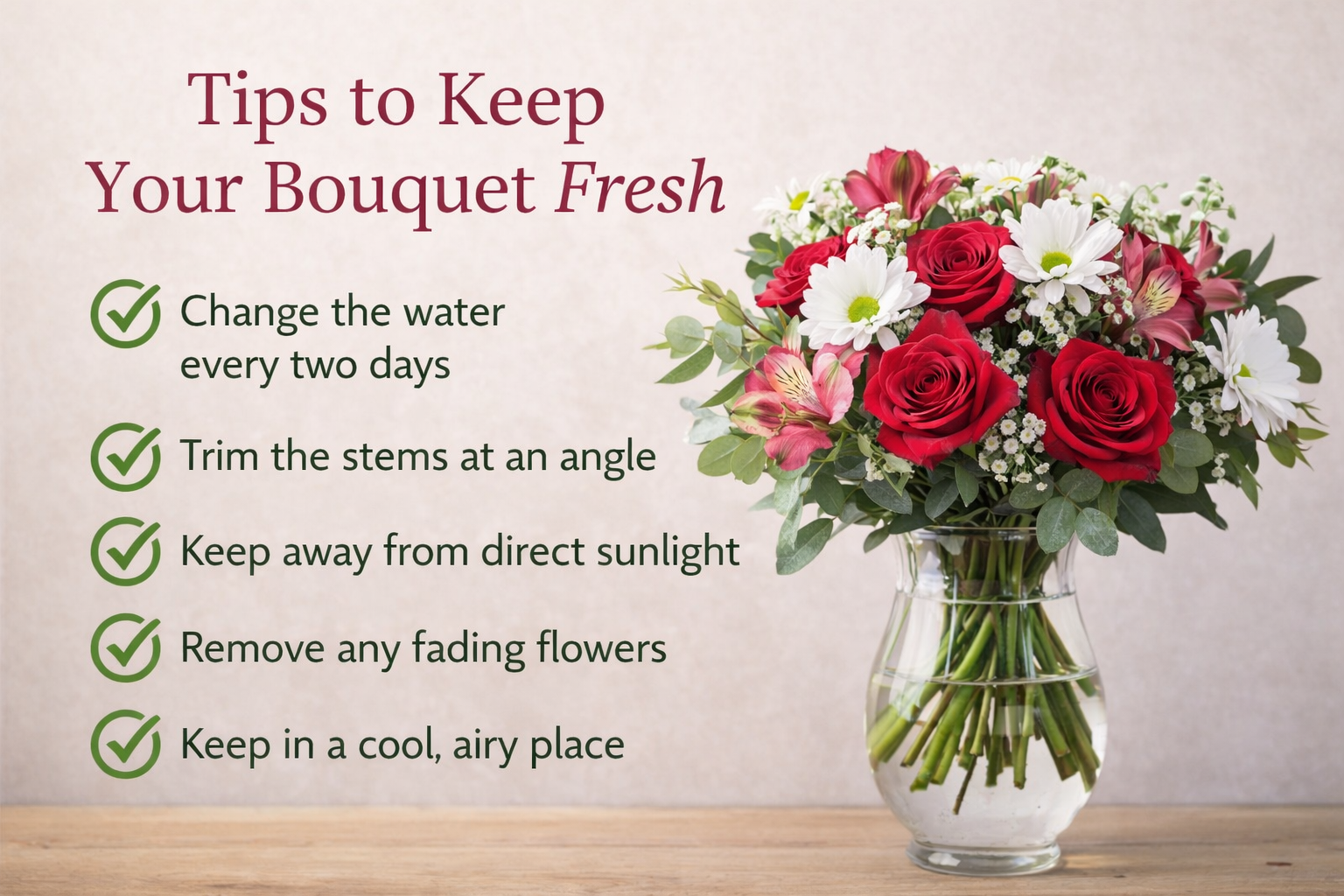 Fresh flowers are delicate and continue to “drink” after delivery, so a little care makes a big difference. With clean water, a quick stem trim,