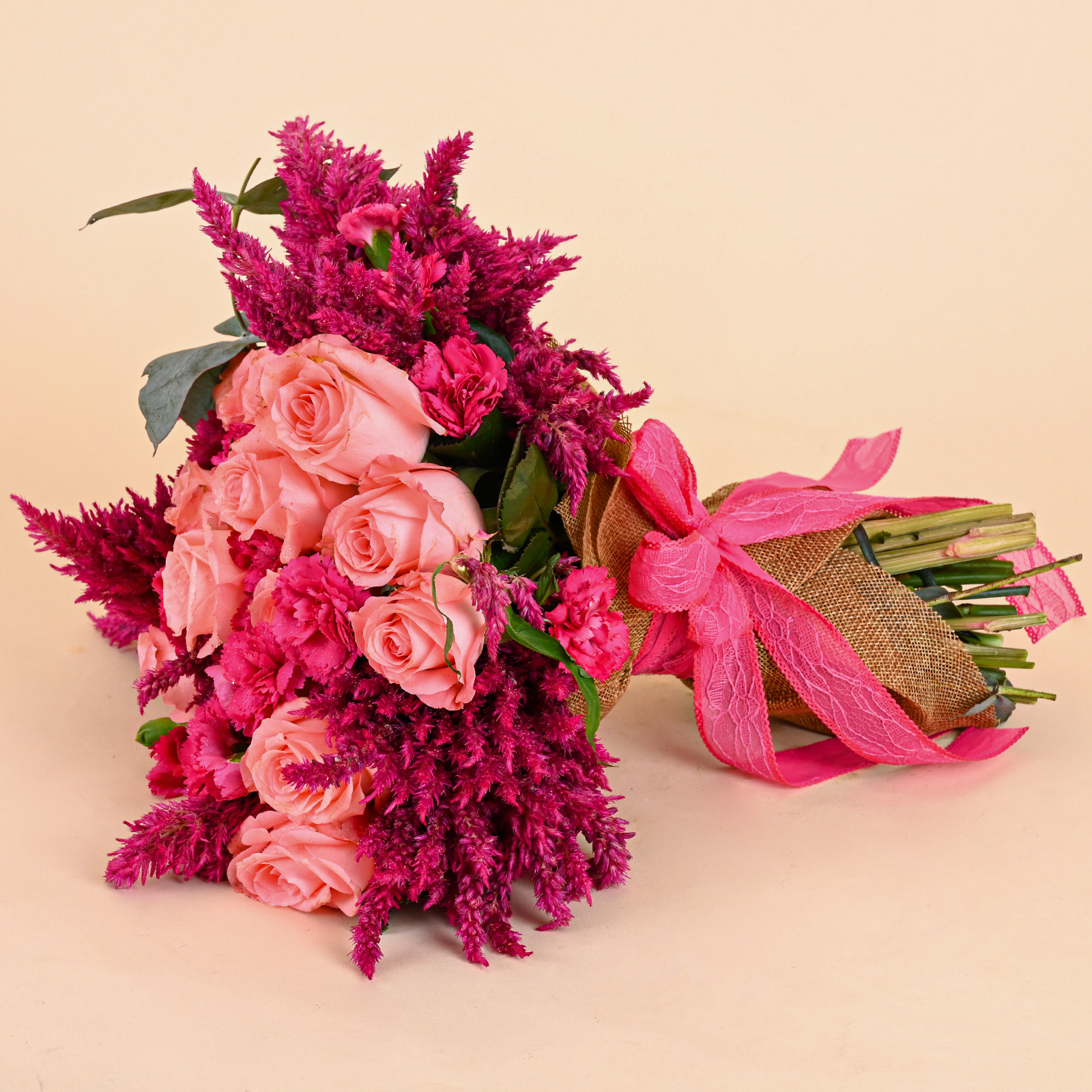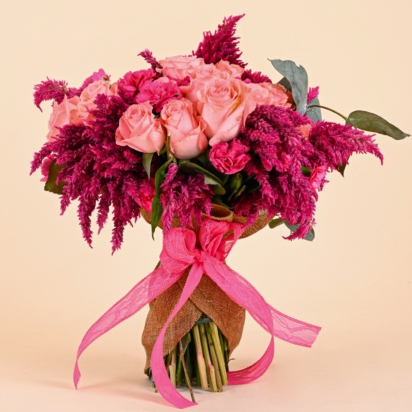 Finished in natural jute wrapping and tied with a bright pink sheer ribbon, Blush Berry Bloom has a rustic yet premium presentation that feels warm, expressive, and gift-ready. This pink flower bouquet is a lovely choice for birthdays, thank-you gifts, celebrations, congratulations, or any occasion when you want to send something graceful, cheerful, and full of feeling.
