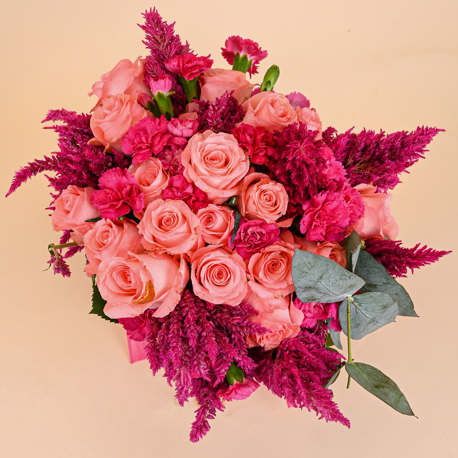 Blush Berry Bloom is a vibrant pink rose bouquet featuring blush pink roses, rich magenta textured blooms, delicate pink floral accents, and touches of fresh eucalyptus. The soft pink roses bring a romantic and elegant feel, while the deeper berry tones add texture, fullness, and a bold pop of colour that makes this bouquet stand out beautifully.