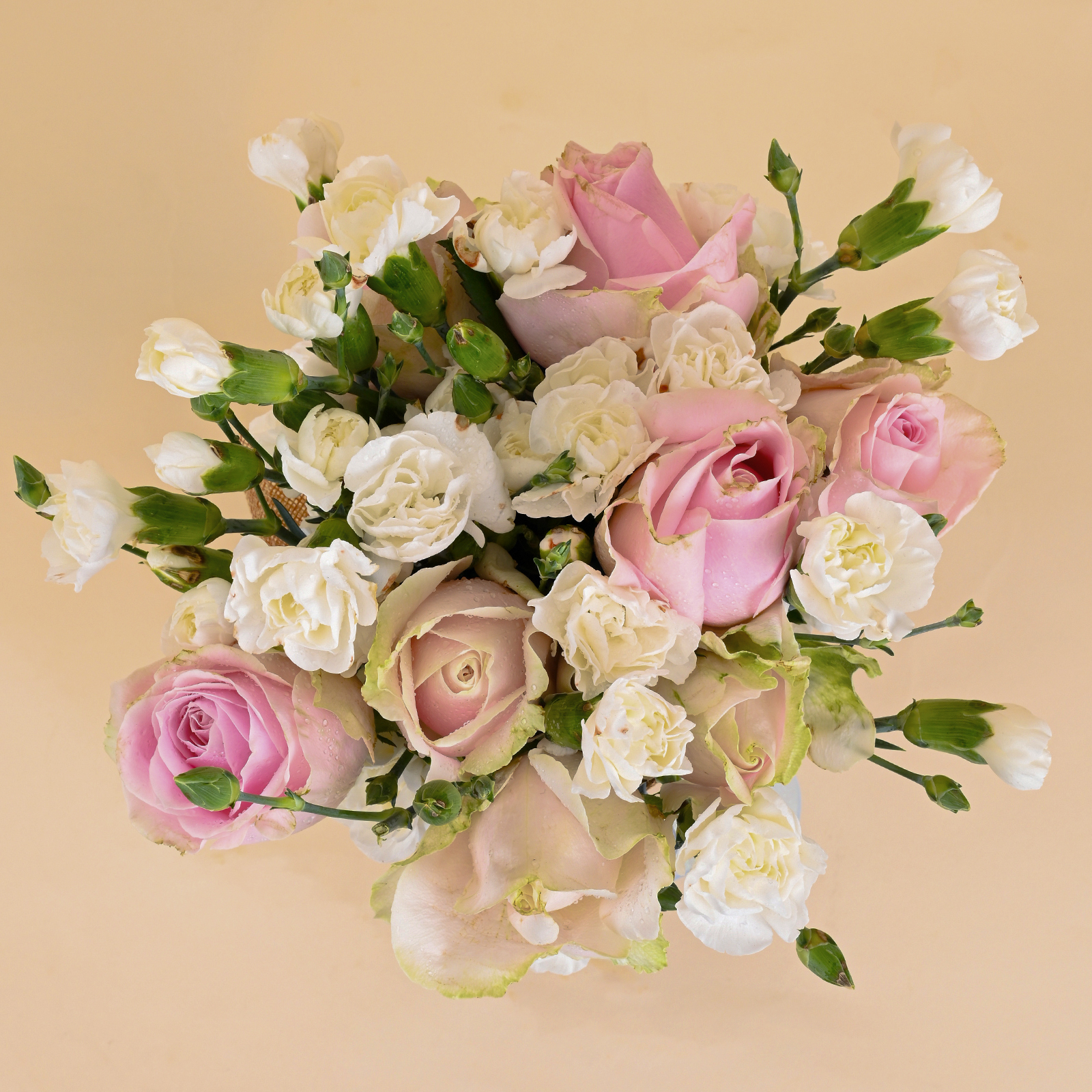 Blush Ivory Grace Bouquet is a soft and elegant pink rose bouquet featuring blush pink roses and delicate white carnations, arranged in a fresh hand-tied style. The pastel pink roses bring warmth, romance, and gentle charm, while the white blooms add softness, texture, and a clean polished finish that makes this bouquet feel graceful and beautifully balanced.