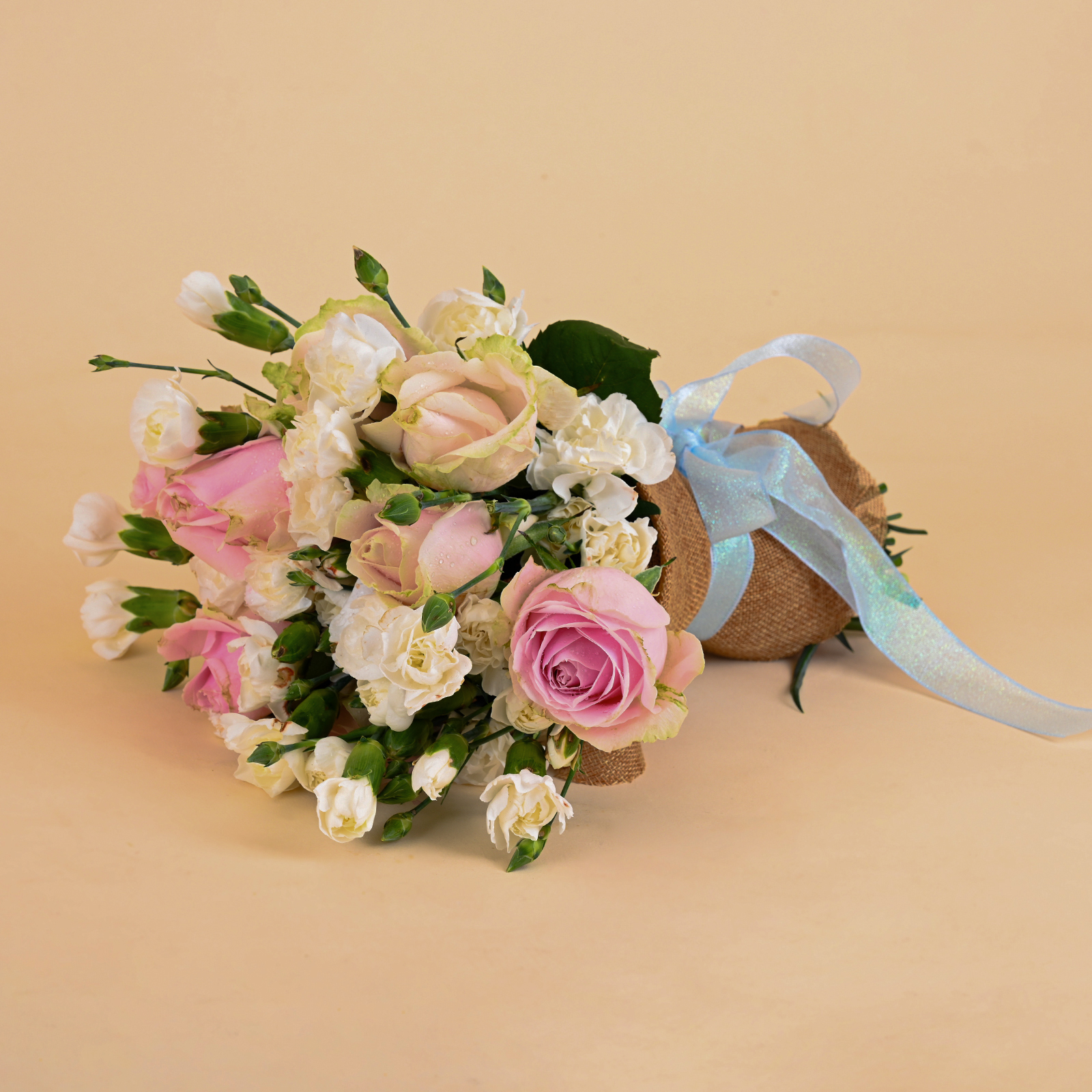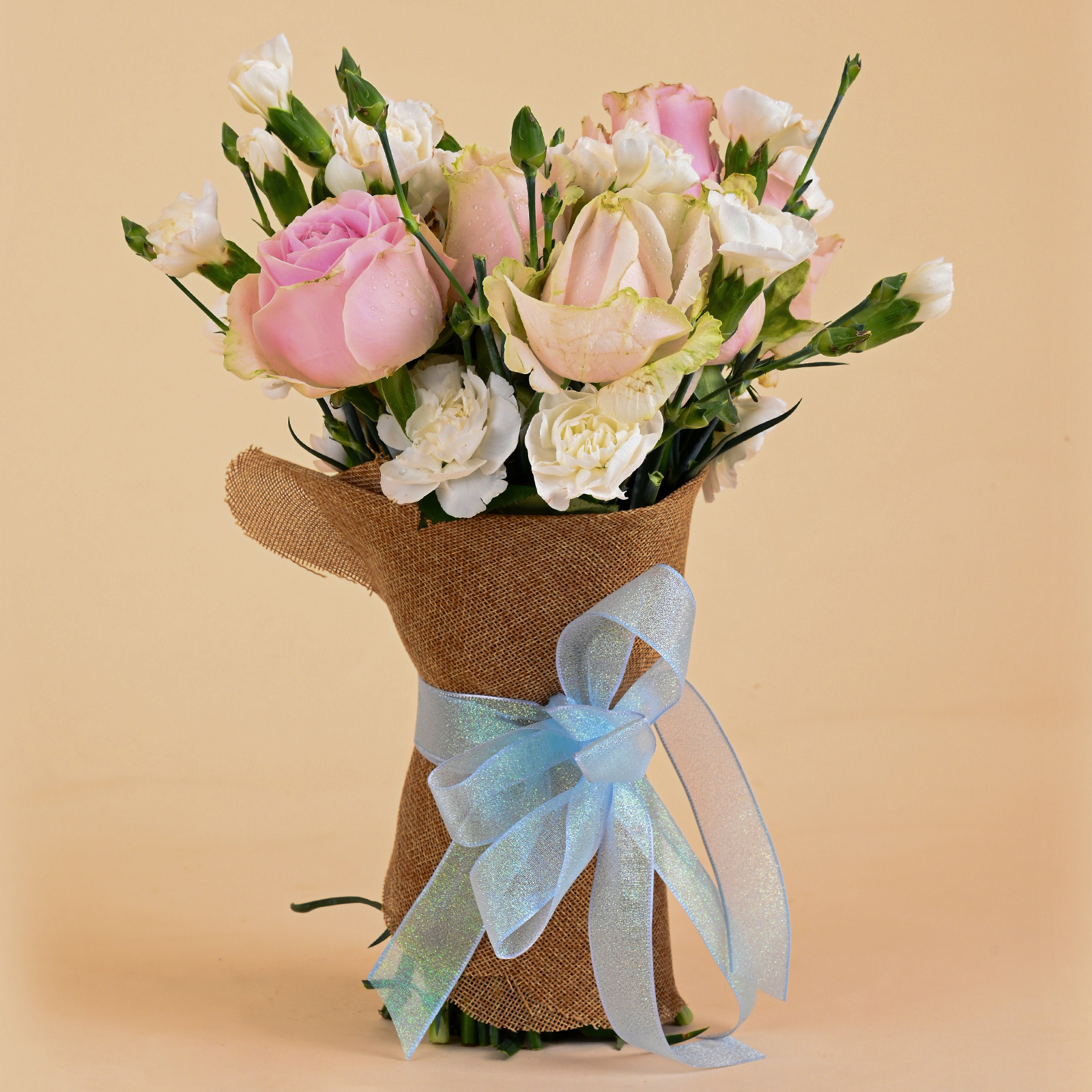 Wrapped in rustic jute and finished with a shimmering pale blue ribbon, Blush Ivory Grace Bouquet has a natural yet premium presentation that feels sweet, thoughtful, and gift-ready. This pink and white flower bouquet is a lovely choice for birthdays, anniversaries, thank-you gifts, congratulations, and simple heartfelt surprises when you want to send something elegant, pretty, and full of warmth.