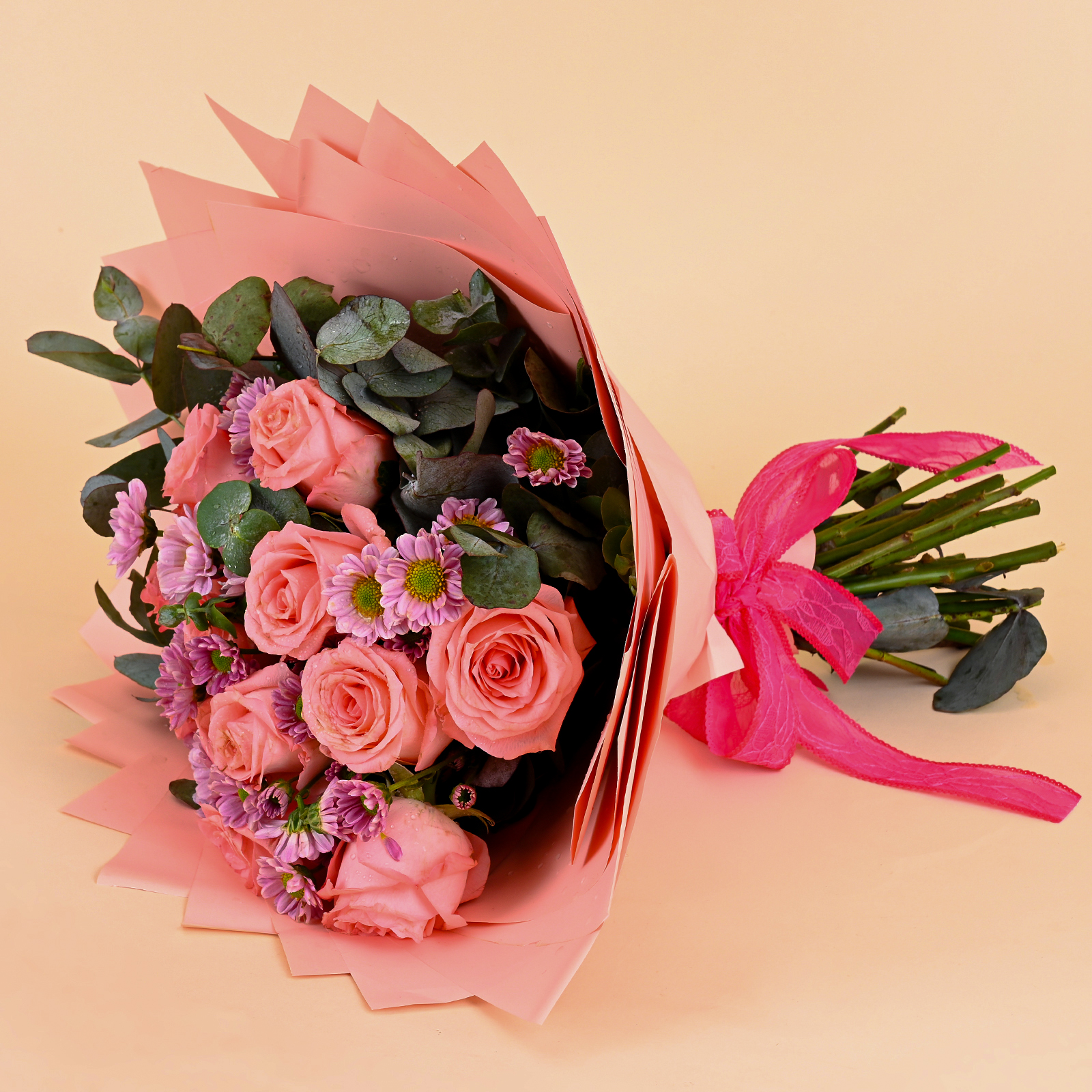 Coral Rose Whisper is a graceful coral rose bouquet featuring coral roses, delicate mauve daisy-style blooms, and fresh eucalyptus accents. The coral roses bring a soft romantic glow, while the smaller pink and mauve flowers add texture, freshness, and a gentle garden-style charm that makes this bouquet feel warm, elegant, and full of life.