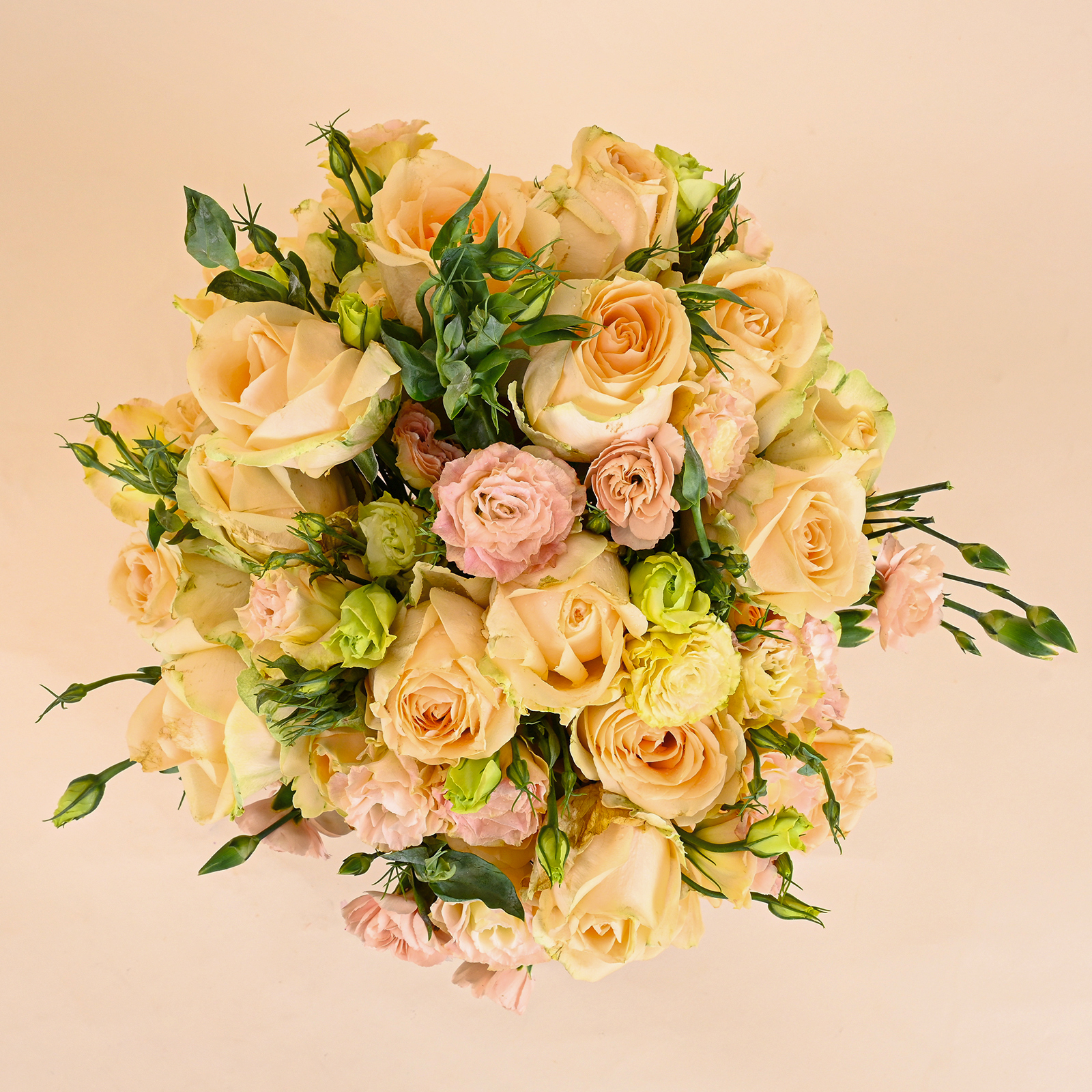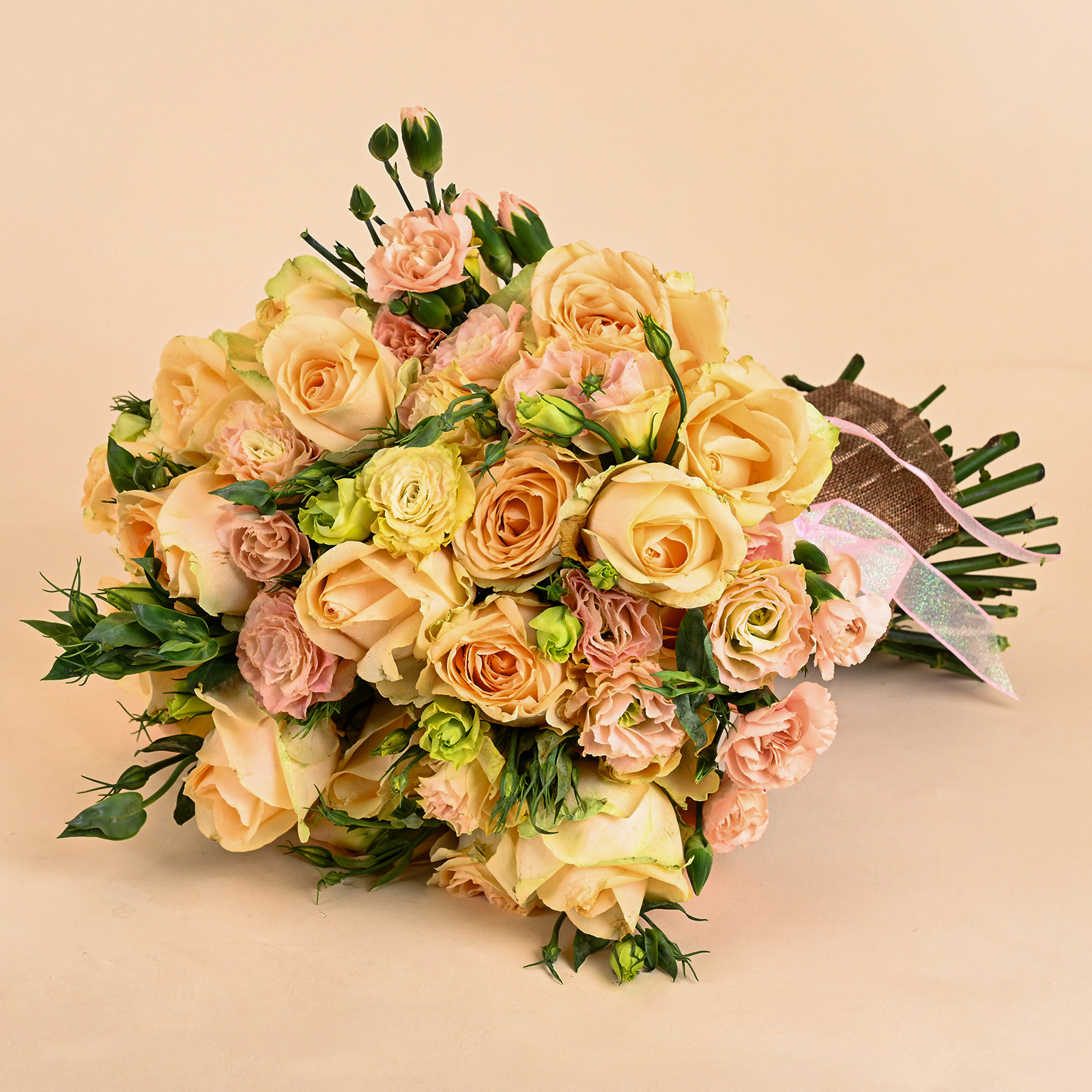 Ivory Peach Charm is a soft and elegant peach rose bouquet featuring ivory-peach roses, delicate blush-toned blooms, and fresh green buds in a natural hand-tied style. The peach roses give the bouquet a warm and graceful look, while the blush flowers and fresh buds add softness, texture, and a light garden-style feel.