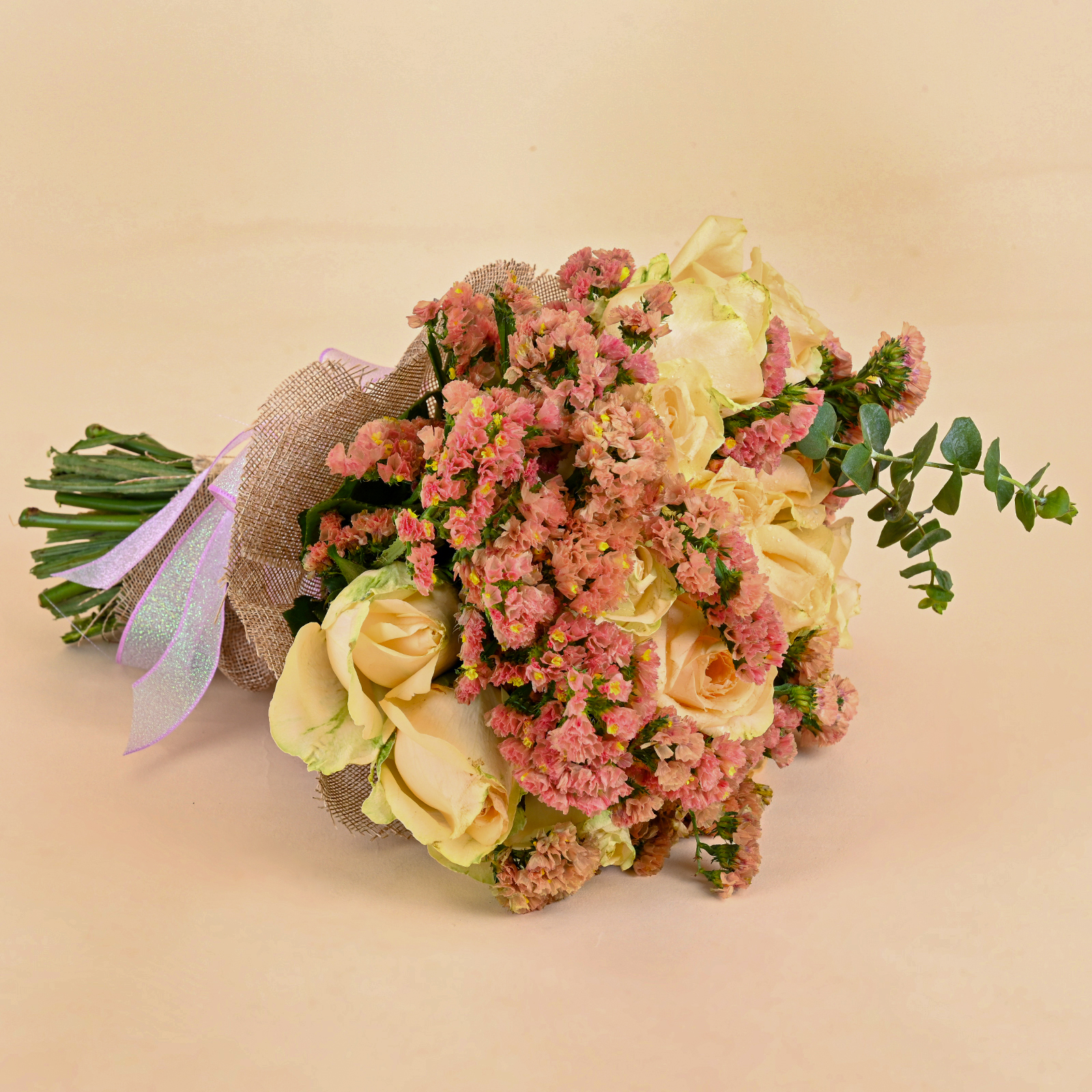 Wrapped in natural jute and finished with a shimmering pastel sheer ribbon, Peach Garden Glow has a rustic yet premium presentation that feels both gentle and gift-ready. This peach and pink flower bouquet is a lovely choice for birthdays, thank-you gifts, congratulations, get well wishes, or simply brightening someone’s day with something soft, elegant, and full of warmth.