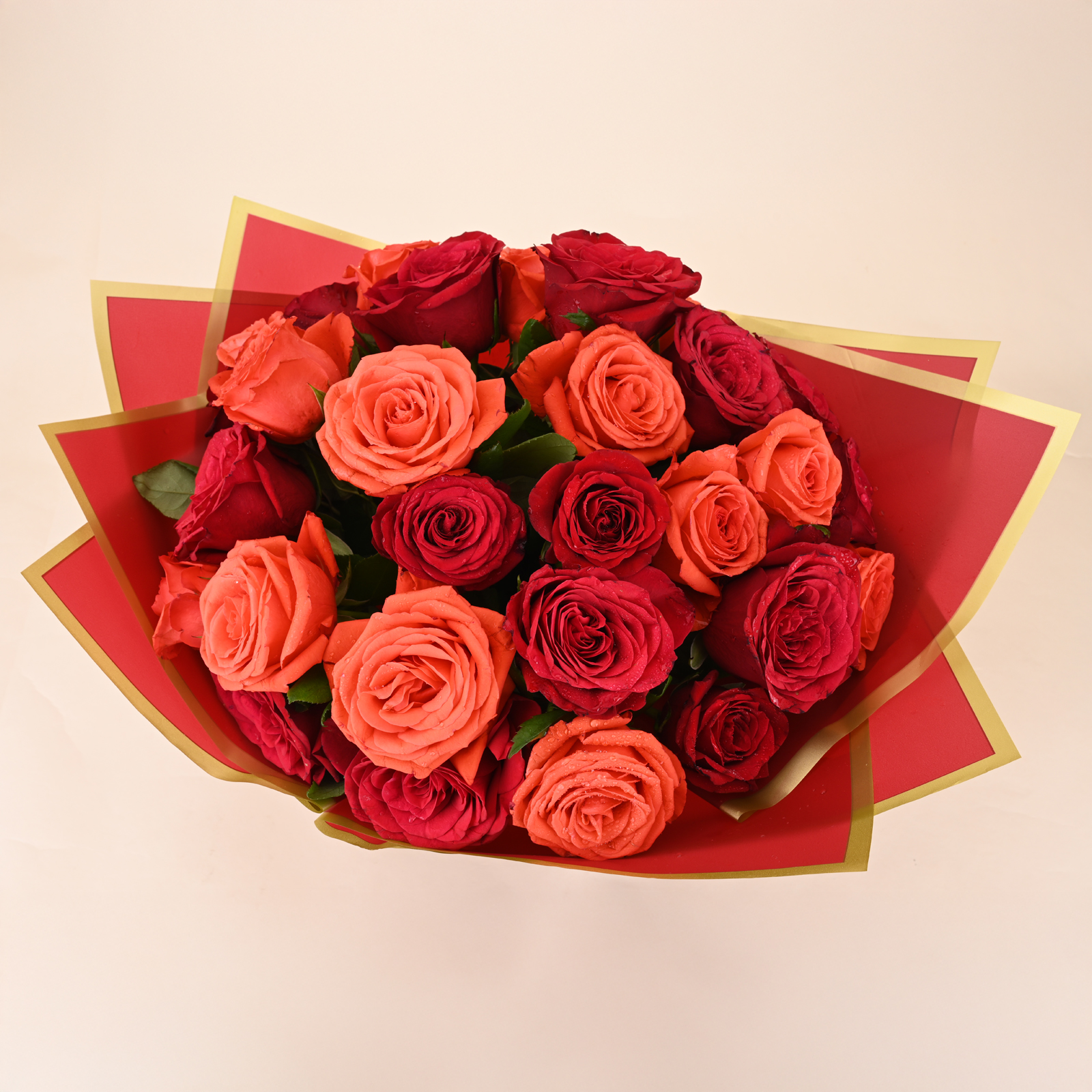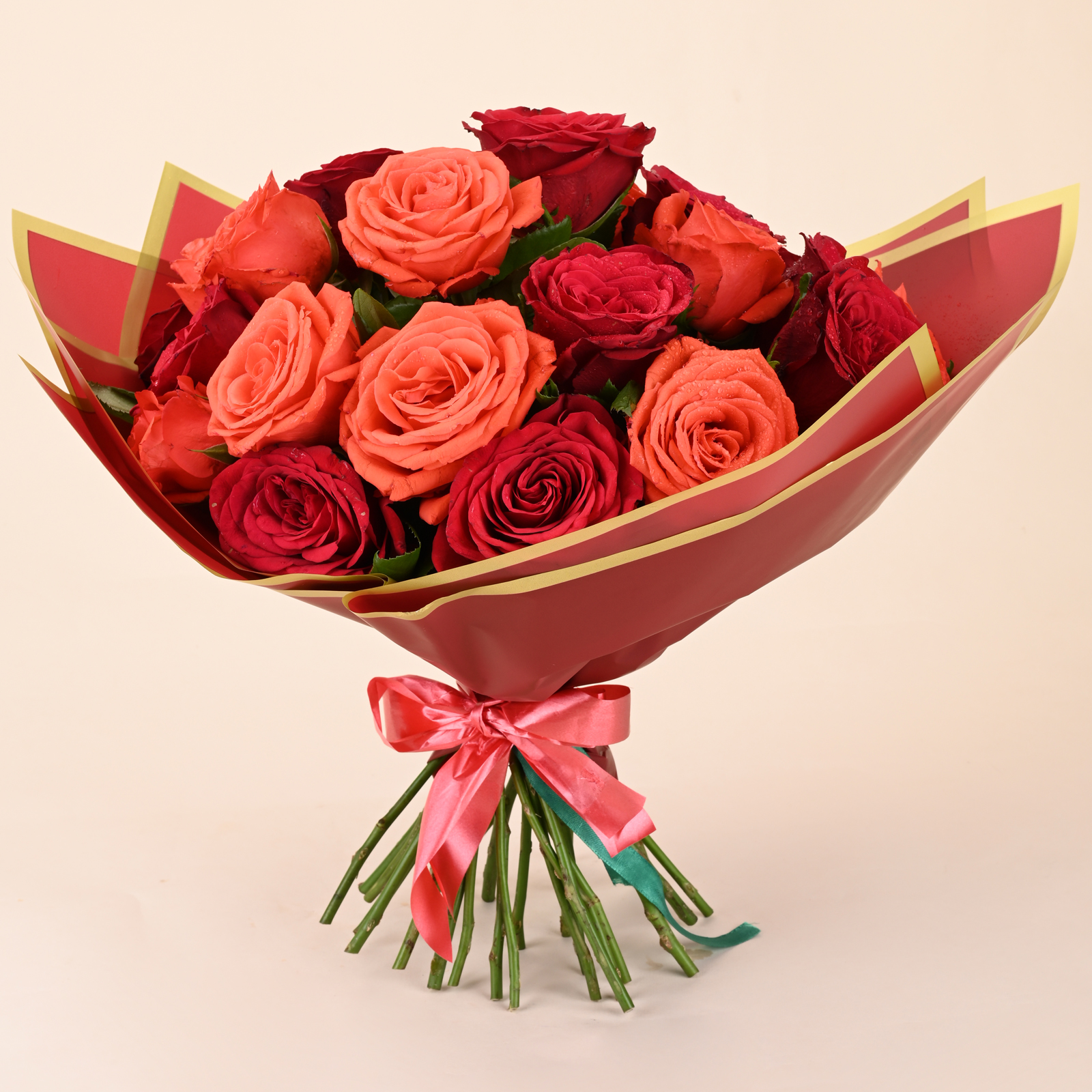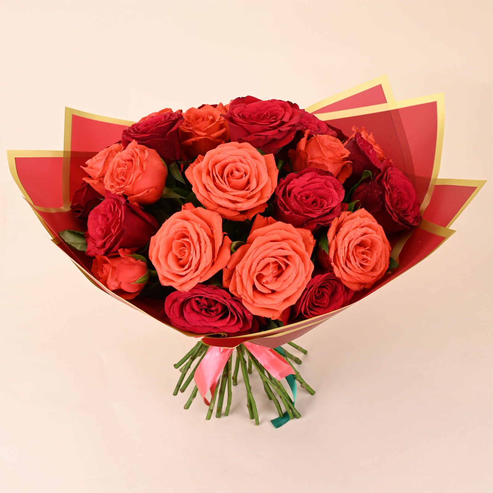 Ruby and Coral Royale Rose Bouquet is a bold mix of deep red roses and warm coral roses arranged to look rich and eye catching. The red roses bring a classic romantic feel, while the coral roses add a bright warm glow that makes the bouquet look fresh and lively.