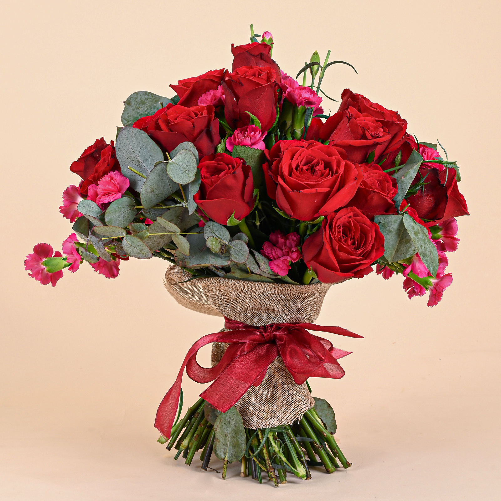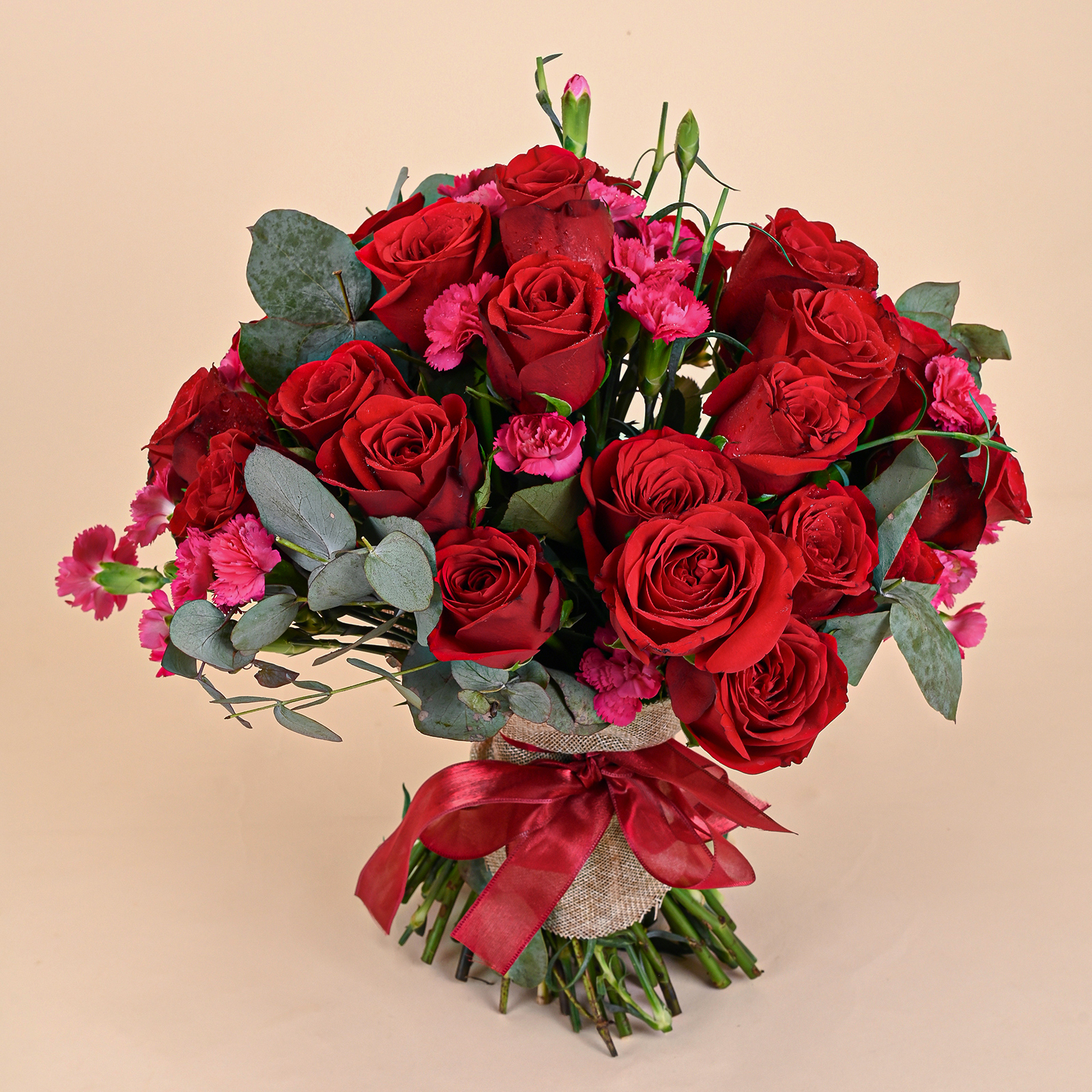 Ruby Pink Romance is a classic red rose bouquet featuring velvety red roses, delicate pink carnation accents, and fresh eucalyptus foliage. The deep red roses create a timeless romantic look, while the soft pink blooms add texture, warmth, and a gentle contrast that makes the bouquet feel both bold and elegant.