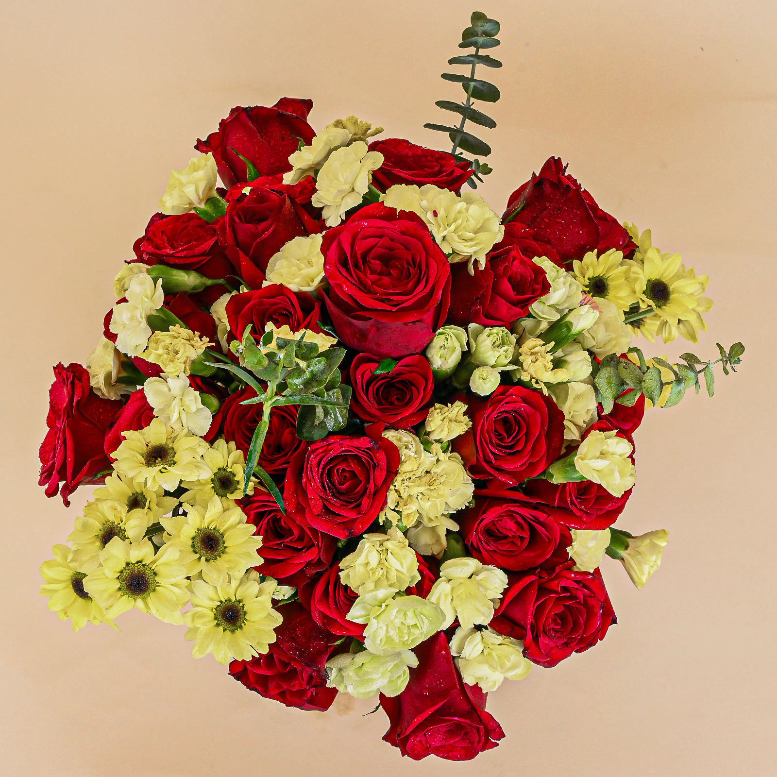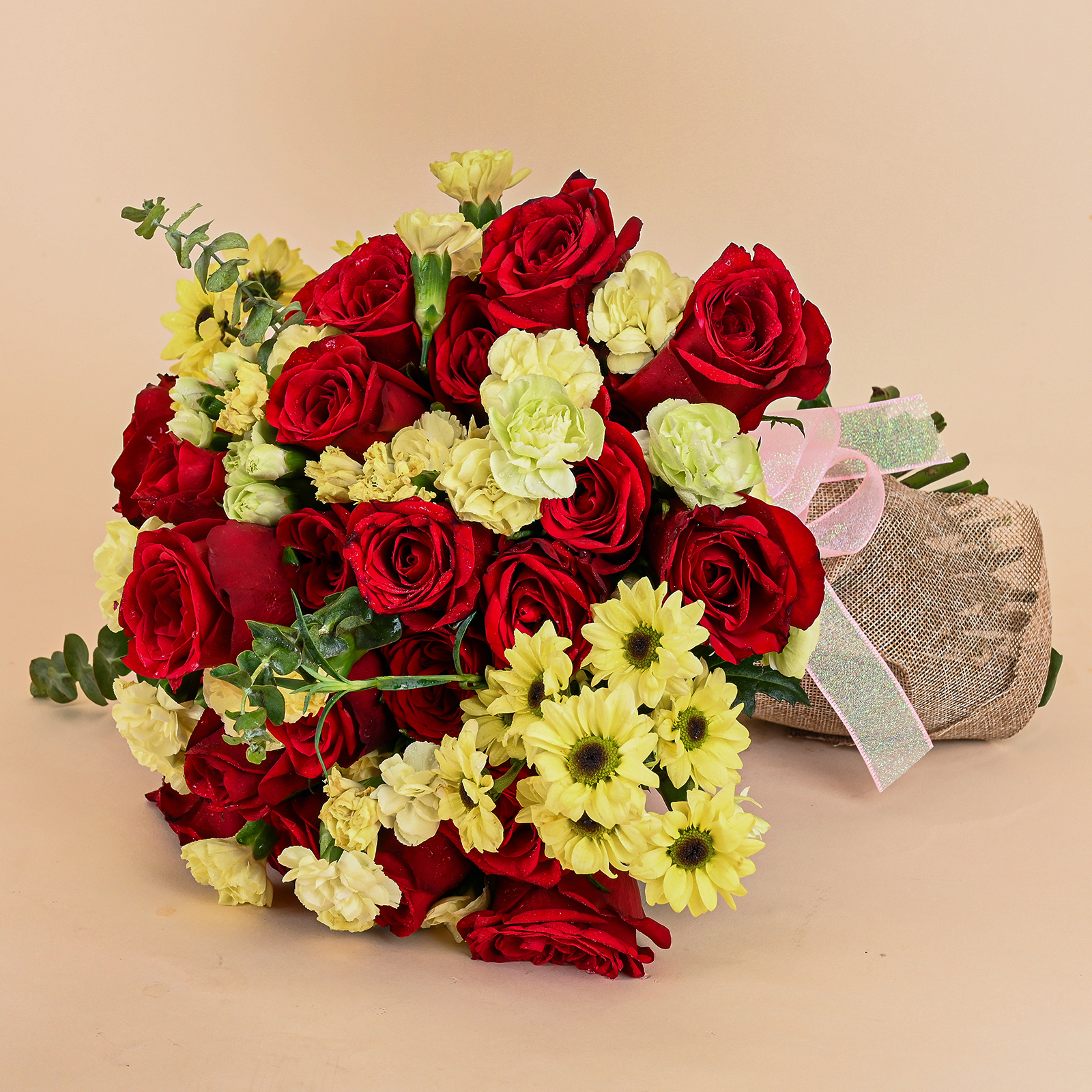 Sunlit Scarlet Bouquet is a vibrant red rose bouquet featuring velvety red roses, soft yellow carnations, and cheerful yellow daisy blooms in a fresh hand-tied arrangement. The rich red roses bring classic romance and elegance, while the yellow flowers add brightness, warmth, and a joyful contrast that makes this bouquet feel lively and full of celebration.