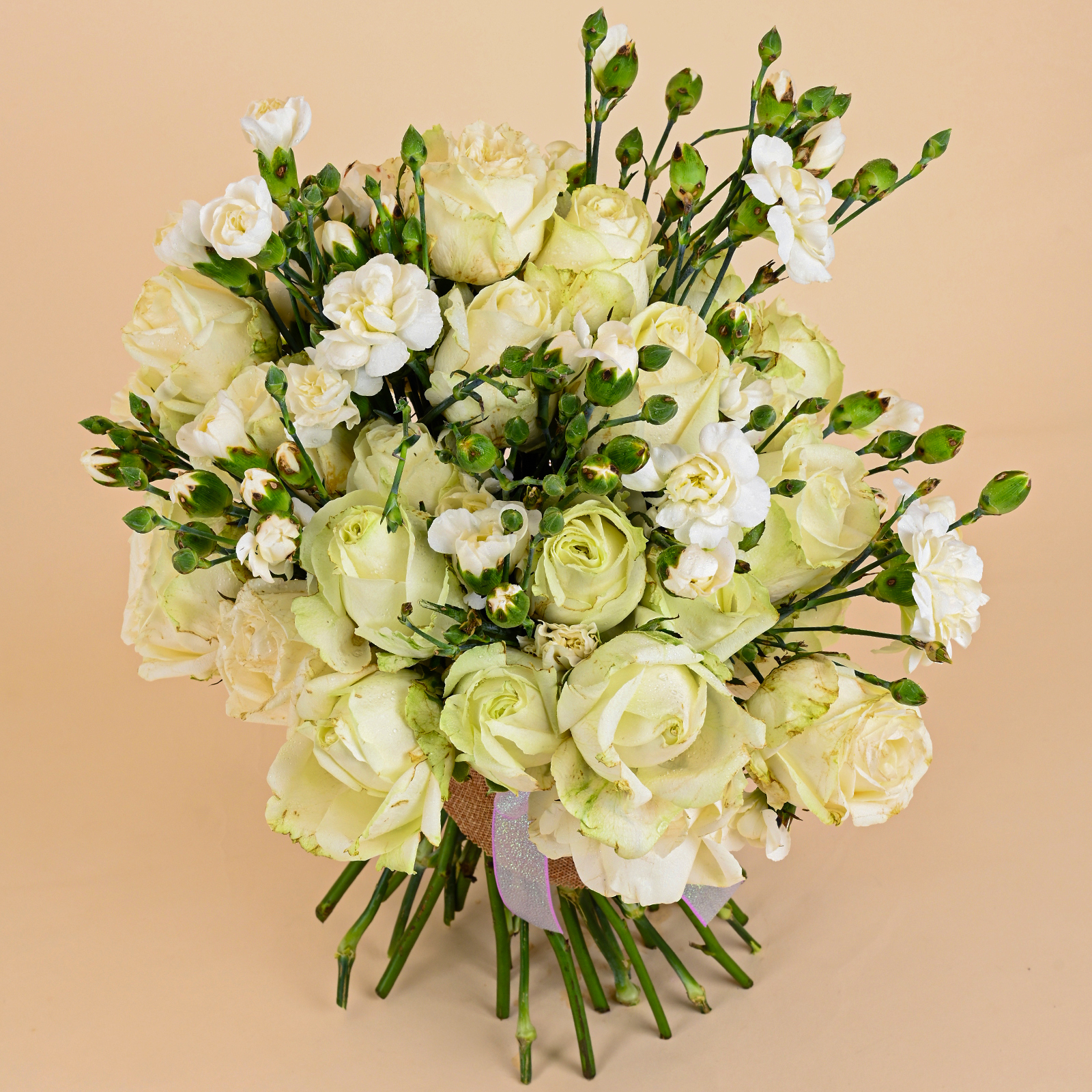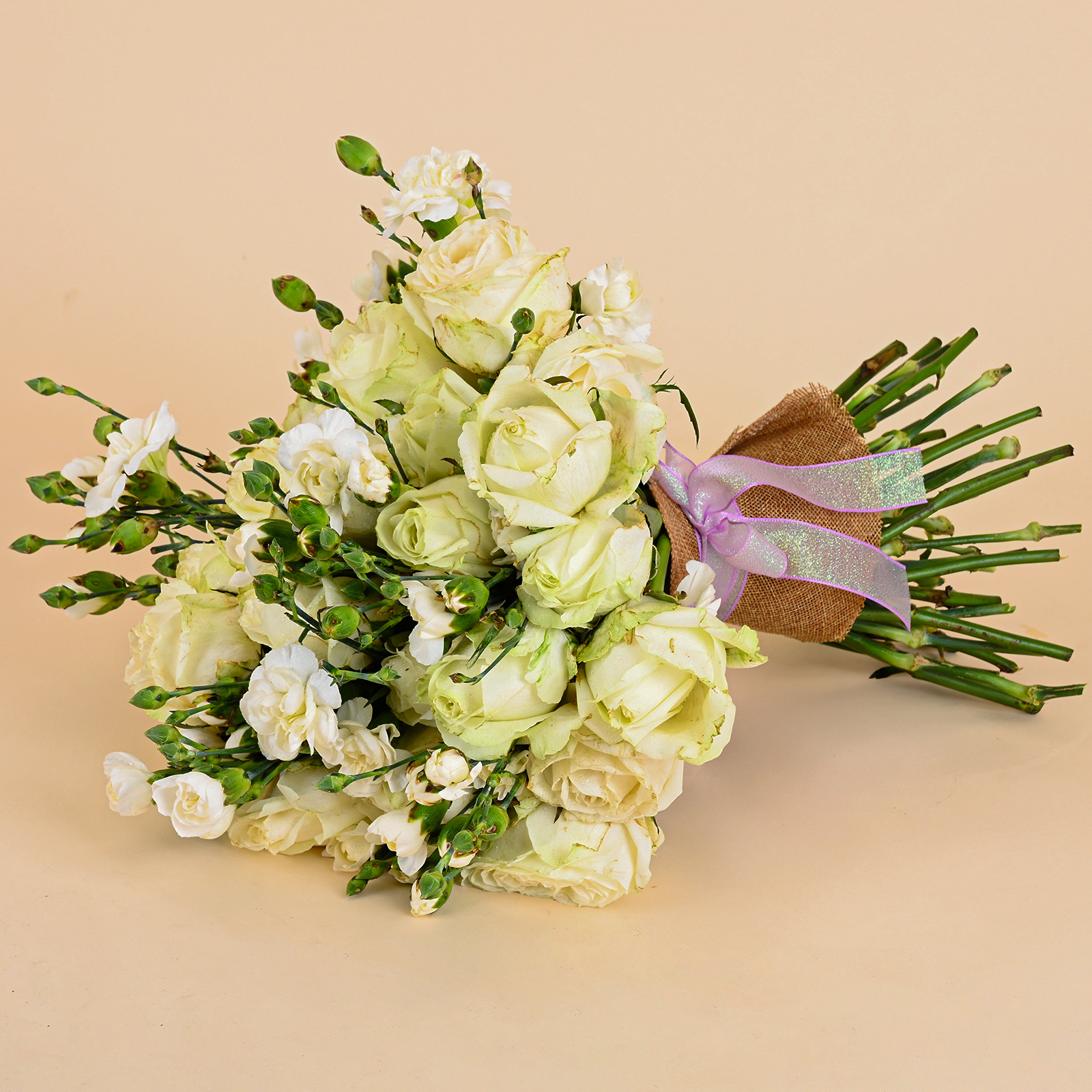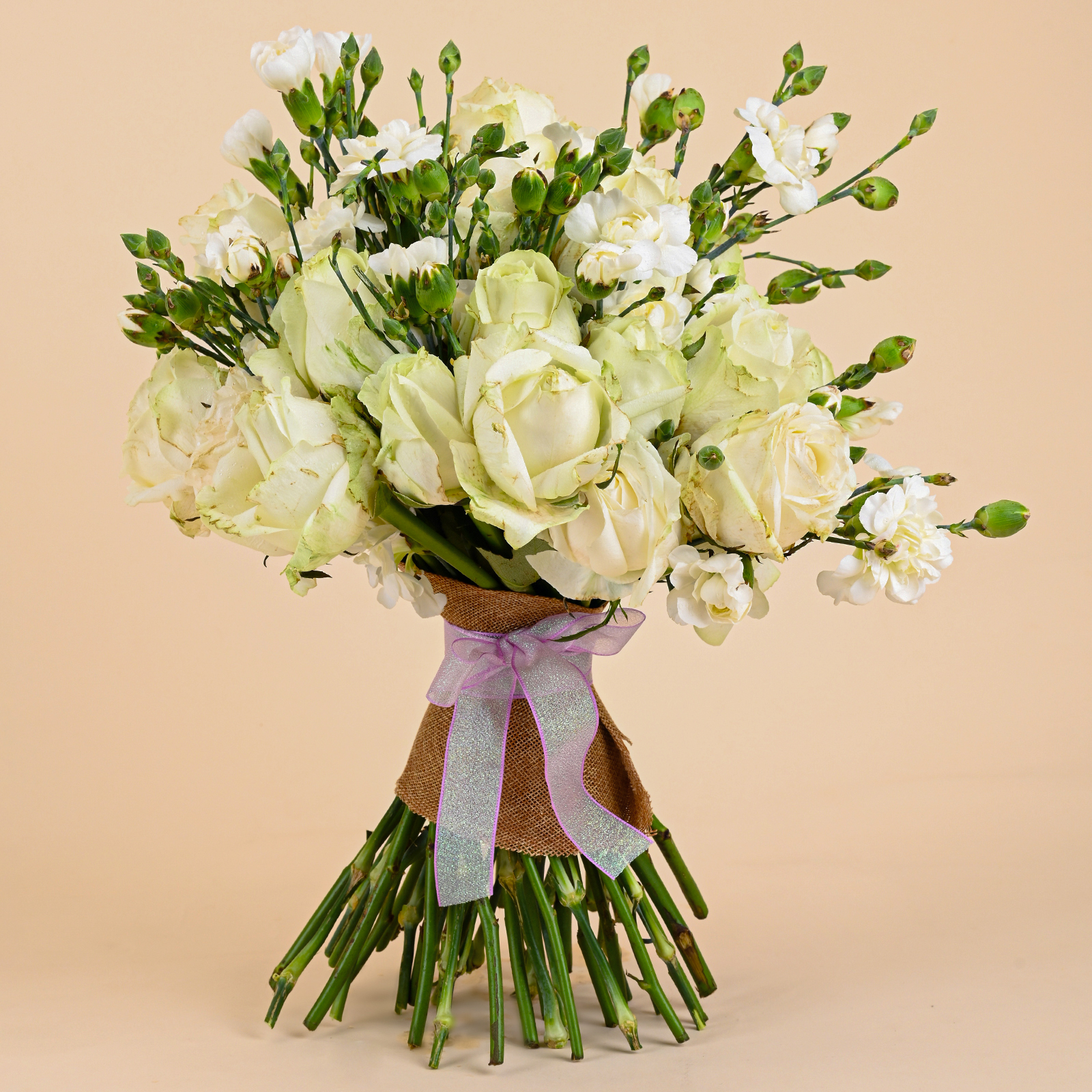 Finished with natural jute wrapping and tied with a shimmering lavender sheer ribbon, White Whisper Bloom has a refined yet distinctive presentation that feels both rustic and premium. This white flower bouquet is a lovely choice for anniversaries, thank-you gifts, sympathy flowers, elegant gifting, and meaningful moments when you want to send something calm, polished, and full of grace.