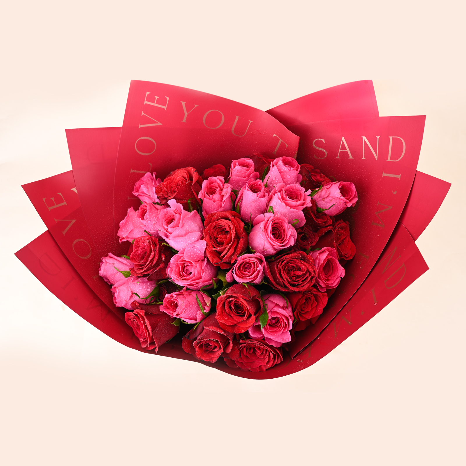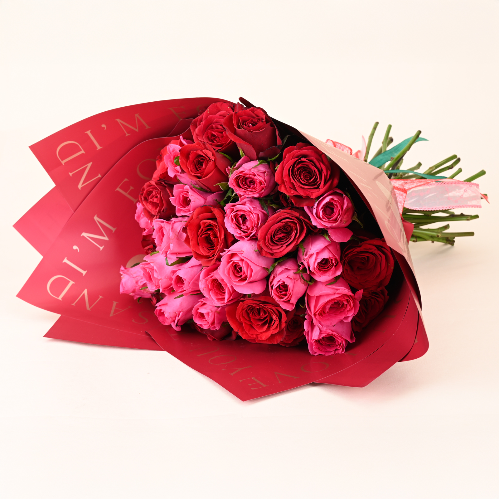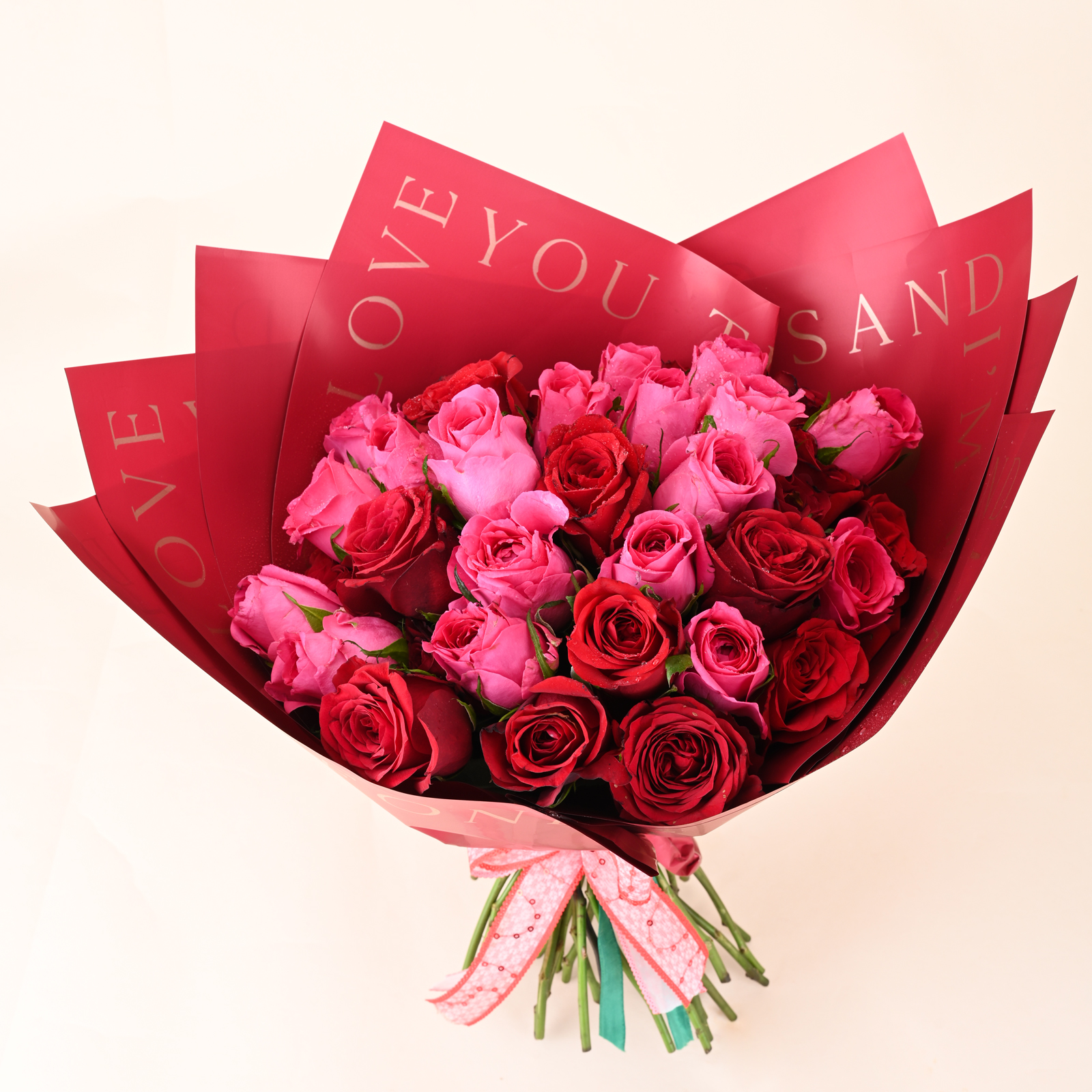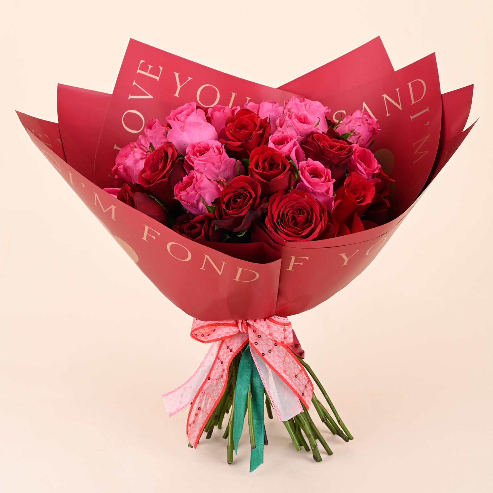 Crimson & Pink Rose Charm Bouquet is a premium red and pink rose bouquet featuring deep red roses and bright pink roses in a rich hand-tied arrangement. The red roses bring romance, warmth, and a bold look, while the pink roses add softness, freshness, and a cheerful touch. Together, they create a bouquet that feels elegant, vibrant, and full of love.