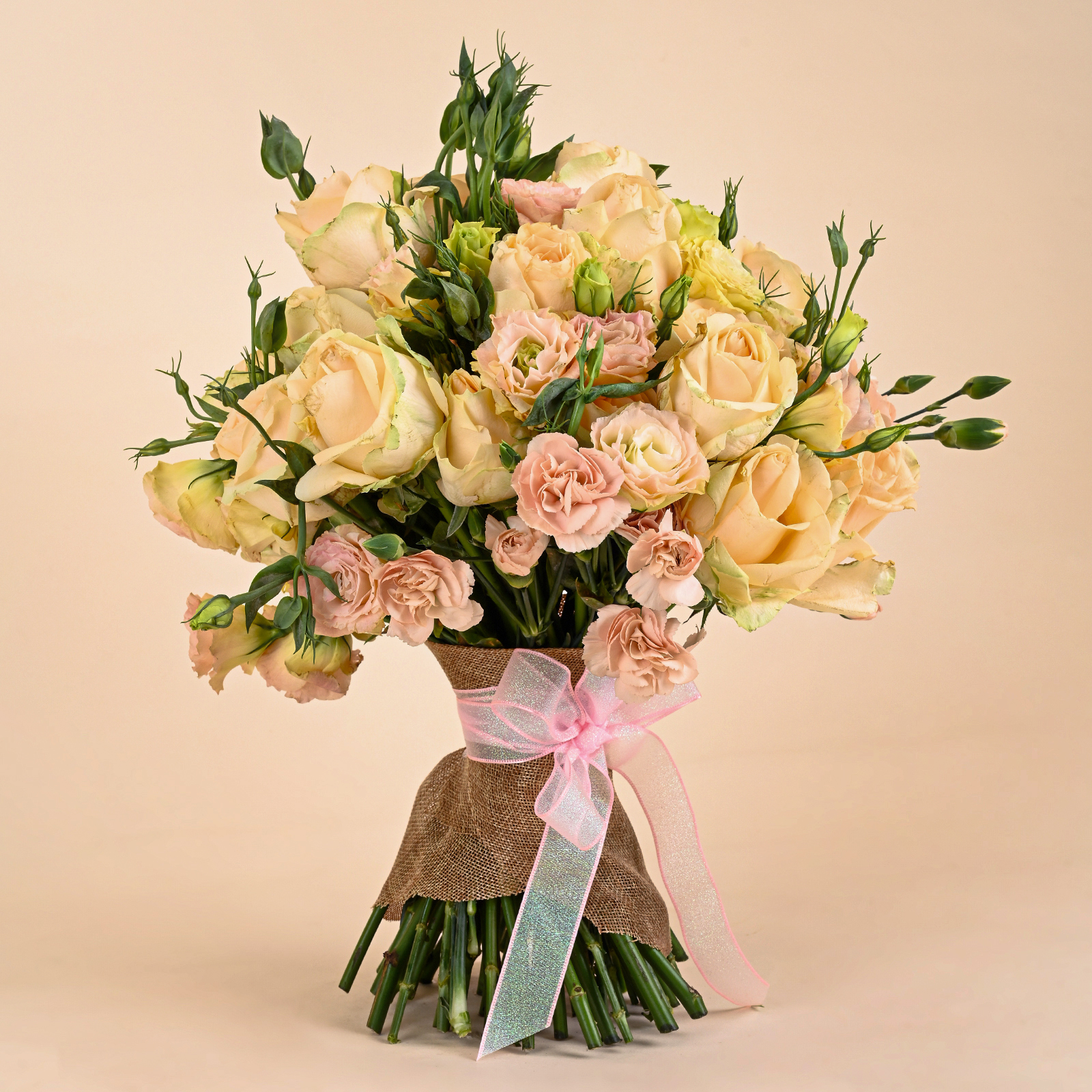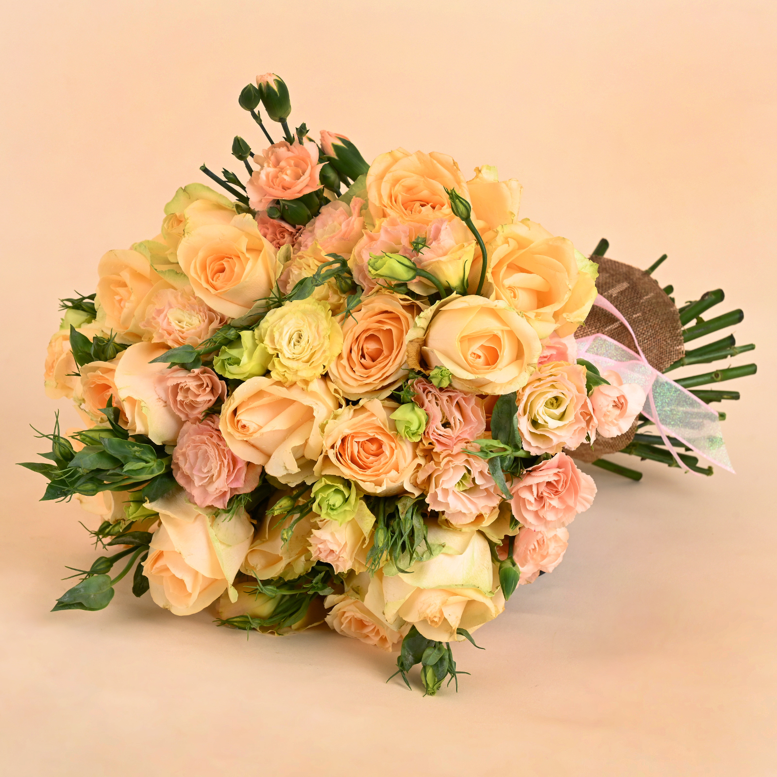Ivory Peach Charm is a soft and elegant peach rose bouquet featuring ivory-peach roses, delicate blush-toned blooms, and fresh green buds in a natural hand-tied style. The peach roses give the bouquet a warm and graceful look, while the blush flowers and fresh buds add softness, texture, and a light garden-style feel.